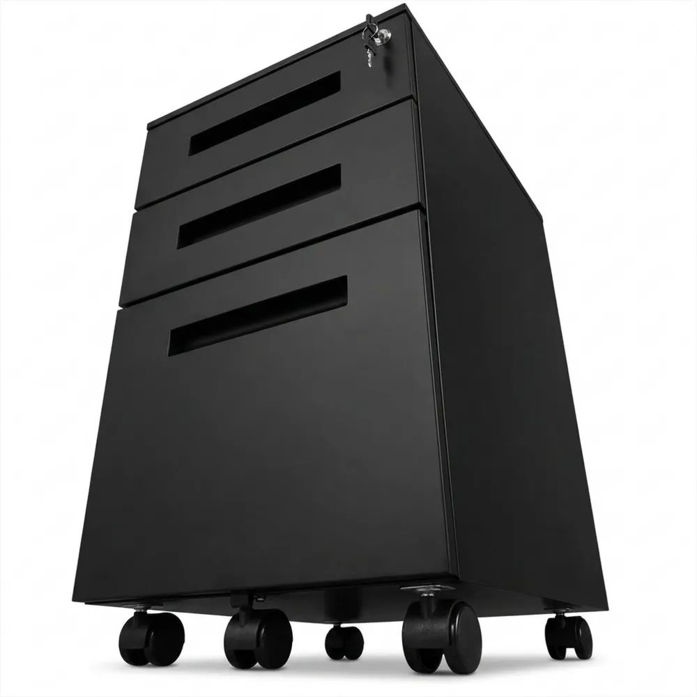 Dieser Rollcontainer besteht aus einer Stahlkonstruktion. Die oberste Schublade verfügt über ein verschiebbares Schreibwaren-Kästchen. Abmessungen: 45x60x39cm (B x H x L). Der Büroschrank bietet 2 Universalschubladen und 1 Schublade für A4-Hängeregister. Jede Schublade kann bis zu 15 kg tragen. Dank 4 Rollen, davon 2 mit Bremsen, ist der Container flexibel einsetzbar. Ein zusätzliches Rad unterstützt die Stabilität. Der Aktenschrank hat ein Schloss mit 2 Schlüsseln. Alle Schubladen können gleichzeitig geöffnet werden. Der Schrank bietet Zentralverriegelung zum Schutz der Privatsphäre. Die Schubladen sind mit Stahlkugellaufschienen ausgestattet, die für einen sanften und geräuschlosen Vollauszug sorgen.