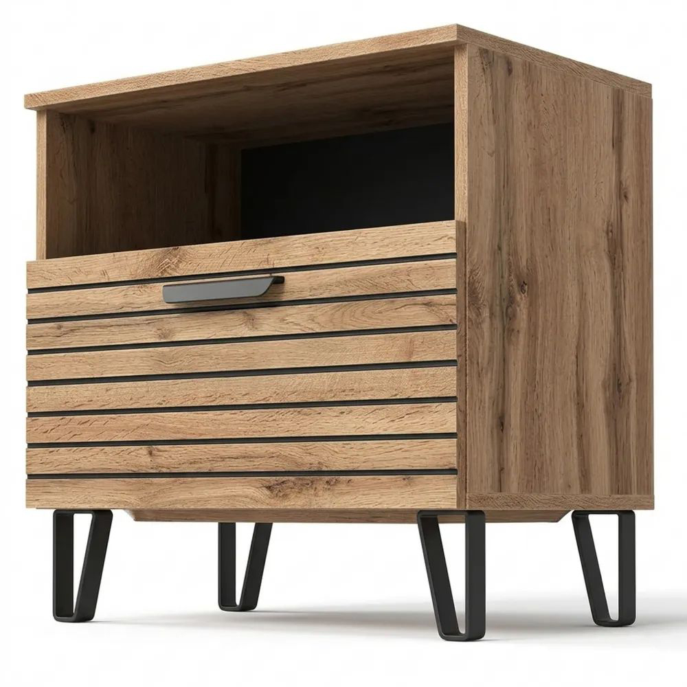 Der Nachttisch bietet praktischen Stauraum in einem schlichten Design, das sich verschiedenen Raumkonzepten anpasst. Die Konstruktion besteht aus pflegeleichter 16 mm Spanplatte, mit Griffen aus Kunststoff und Füßen aus Metall. Der Nachttisch ist in den Maßen 60 cm Breite, 38 cm Tiefe und 58 cm Höhe erhältlich.