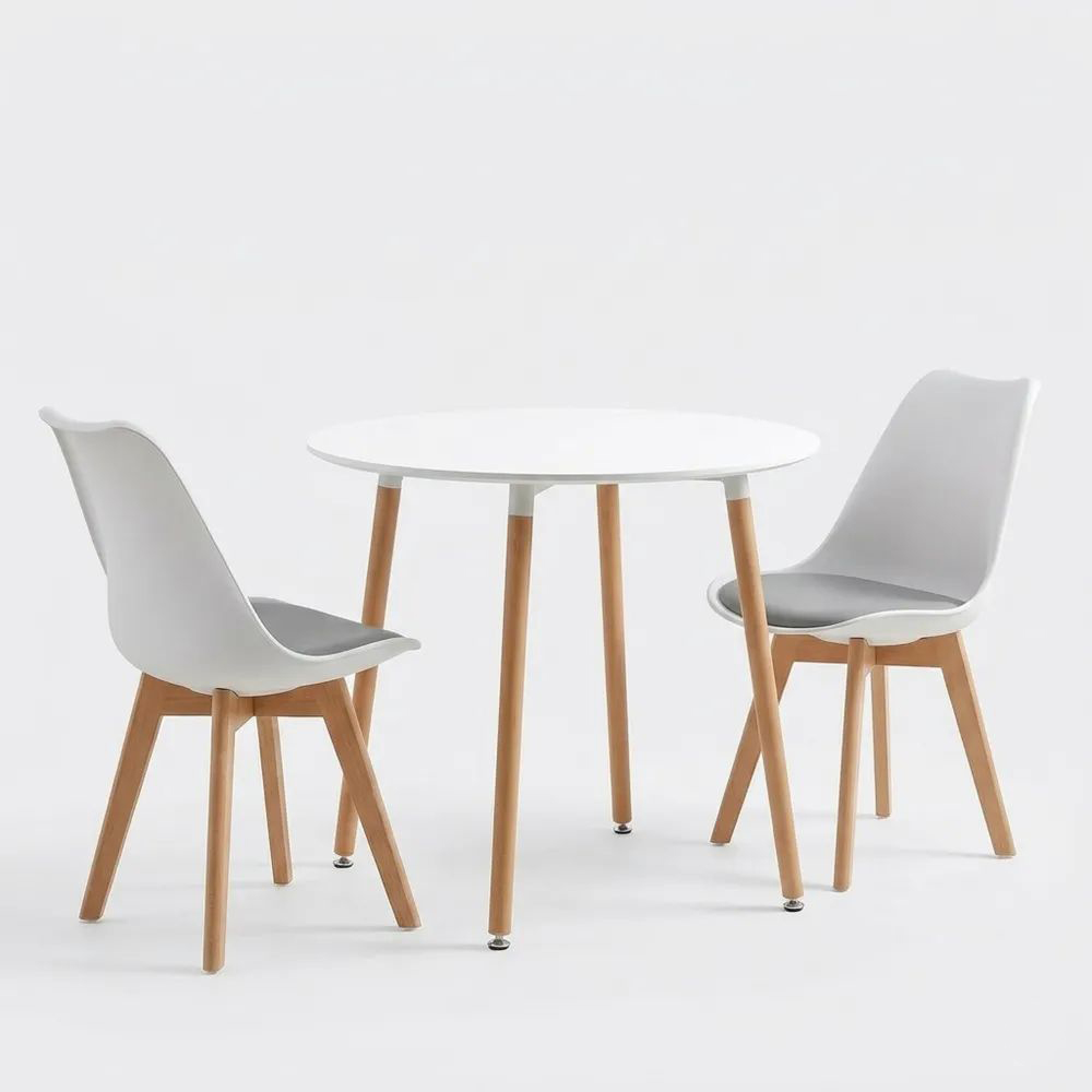 Essgruppe bestehend aus einem runden Tisch und zwei Stühlen. Der Tisch hat die Maße 80 x 80 x 75 cm und besteht aus MDF-Platten mit Beinen aus Buchenholz. Die Kunststoffstühle verfügen über ein Sitzkissen und Beine aus Buchenholz. Gummifüße schützen den Boden vor Kratzern und reduzieren Lärm. Die Sitzgruppe eignet sich für verschiedene Räume wie Esszimmer, Wohnzimmer oder Küche. Verstellbare Fußpolster passen sich Bodenunebenheiten an. Die Konstruktion unterstützt eine ergonomische Sitzhaltung. Weitere Details zu Materialien und Maßen entnehmen Sie bitte der Produktbeschreibung.
